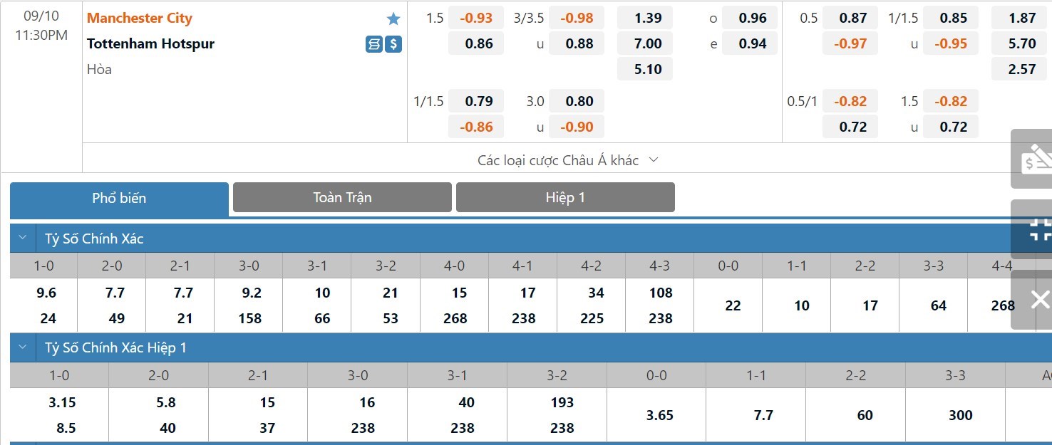 Xem tỷ lệ kèo cá cược bóng đá trực tuyến Manchester City vs Tottenham