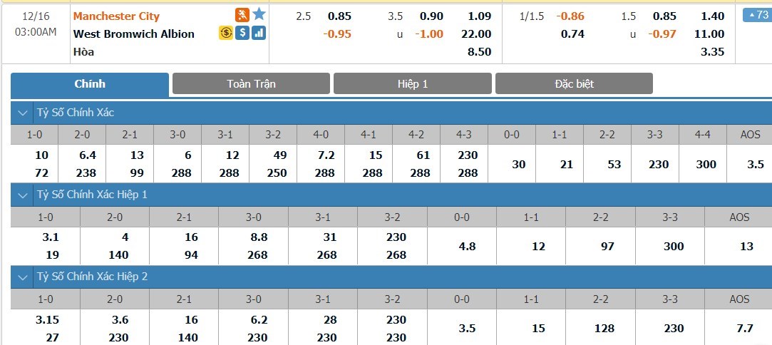 Xem tỷ lệ kèo cá cược bóng đá trực tuyến Manchester City vs West Bromwich