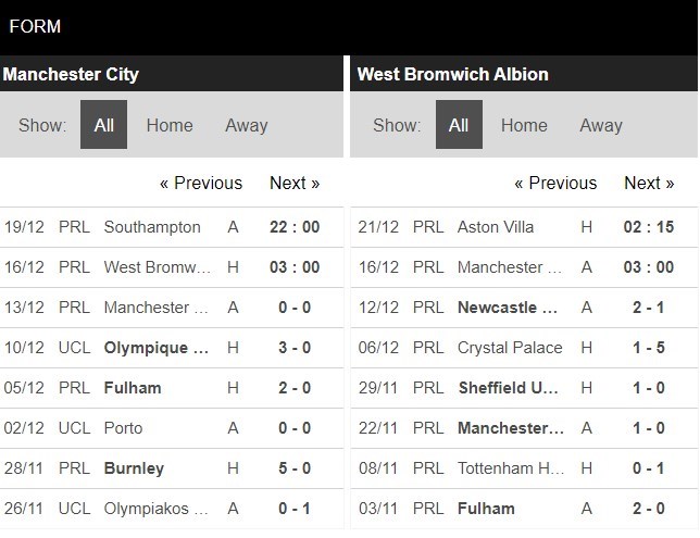 Thống kê phong độ Manchester City vs West Bromwich