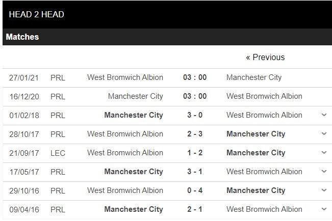 Thống kê đối đầu Manchester City vs West Bromwich