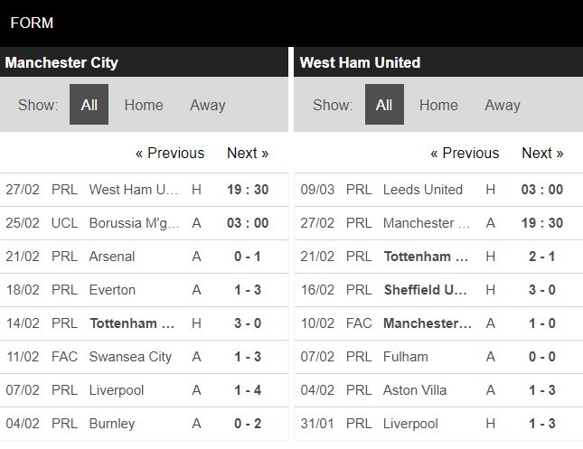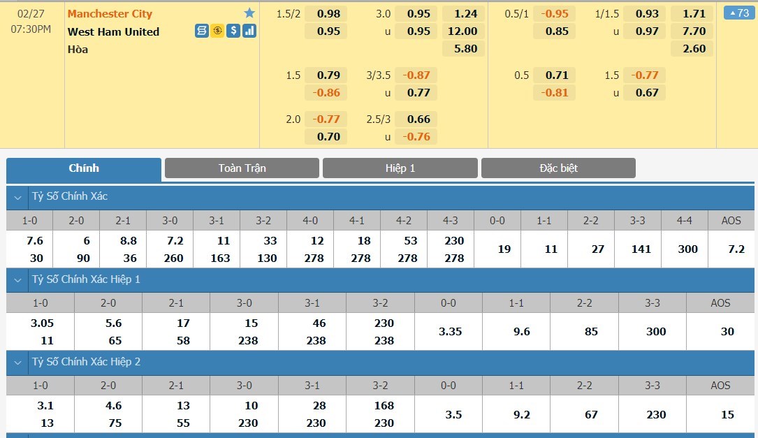 Xem tỷ lệ kèo cá cược bóng đá trực tuyến Manchester City vs West Ham