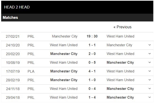 West Ham là đối thủ ưa thích đối với Manchester City khi mà trong 10 lần gần nhất chạm trán với nhau, thầy trò HLV Pep có 9 thắng và hoà 1. Phong độ của Manchester City đang là vô cùng ấn tượng khi thắng 18 trận liên tiếp trên mọi đấu trường. West Ham thì đã toàn thua trong 5 lần gần nhất làm khách tại EITHAD. Chính vì thế, sẽ khó trông đợi đội khách sẽ có 1 kết quả tốt. Hàng thủ của đôi bên đang hoạt động tốt khi Manchester City chỉ nhận 3 bàn thua trong 5 trận trước đó còn West Ham có 2 lần lọt lưới. 90 phút tới có thể là 1 thắng lợi nhẹ nhàng cho chủ nhà.