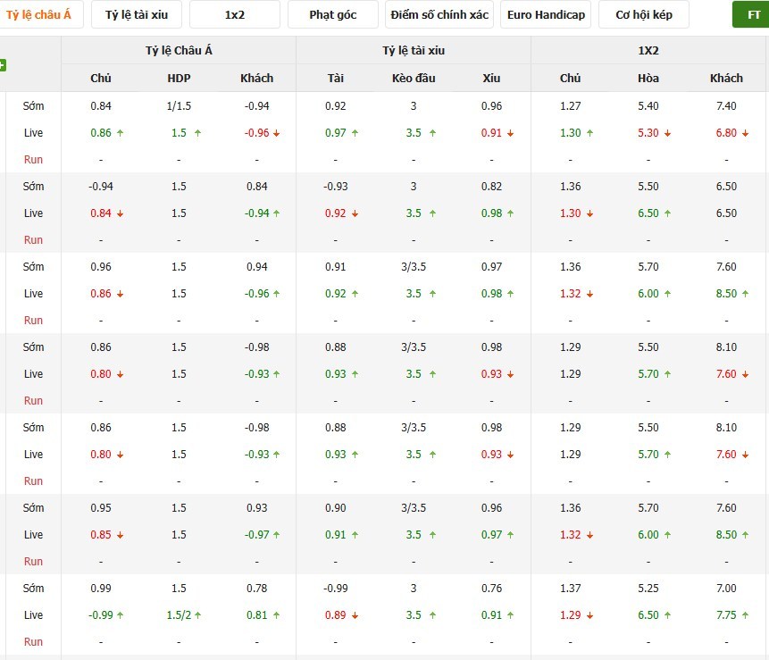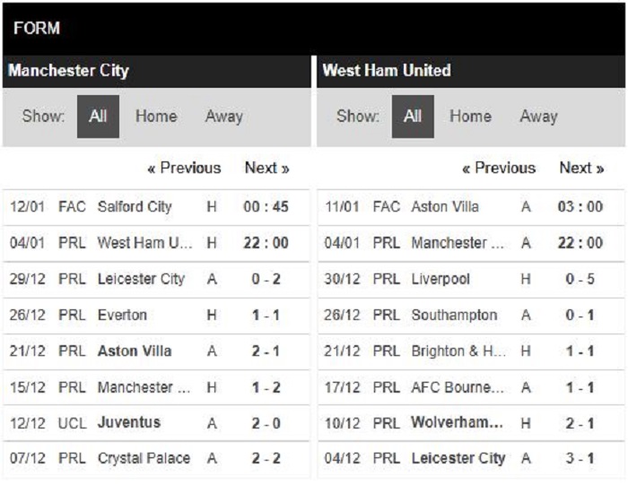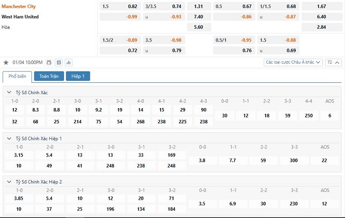 Xem tỷ lệ kèo cá cược bóng đá trực tuyến Manchester City vs West Ham United