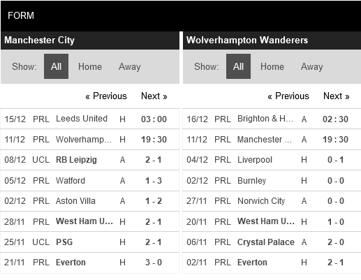 Thống kê đối đầu Manchester City vs Wolverhampton