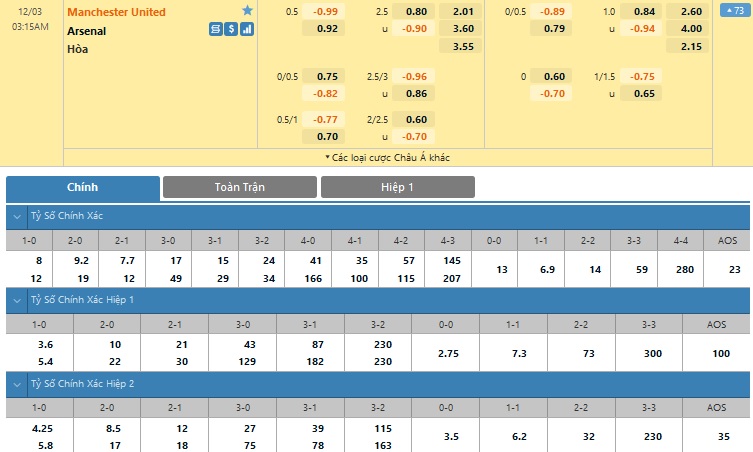 Xem tỷ lệ kèo cá cược bóng đá trực tuyến Manchester United vs Arsenal