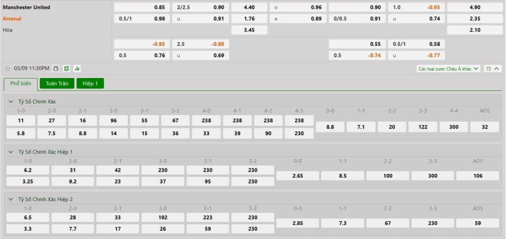 Xem tỷ lệ kèo cá cược bóng đá trực tuyến Manchester United vs Arsenal
