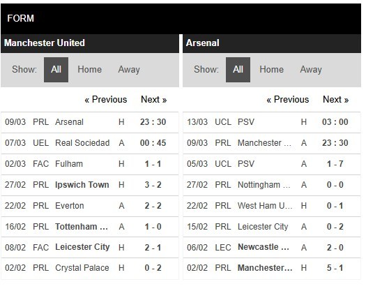 Manchester United vừa có trận hòa 1-1 với Real Sociedad trong khuôn khổ lượt đi vòng 1/8 Europa League. Vị trí của hai đội hiện tại đủ nói lên rằng thời điểm này, Manchester United không phải đối trọng xứng tầm của Arsenal. Trong 4 trận gần nhất trên mọi đấu trường, Manchester United chỉ mang về 1 thắng lợi, còn lại là 2 trận hòa và thua 1 trận.