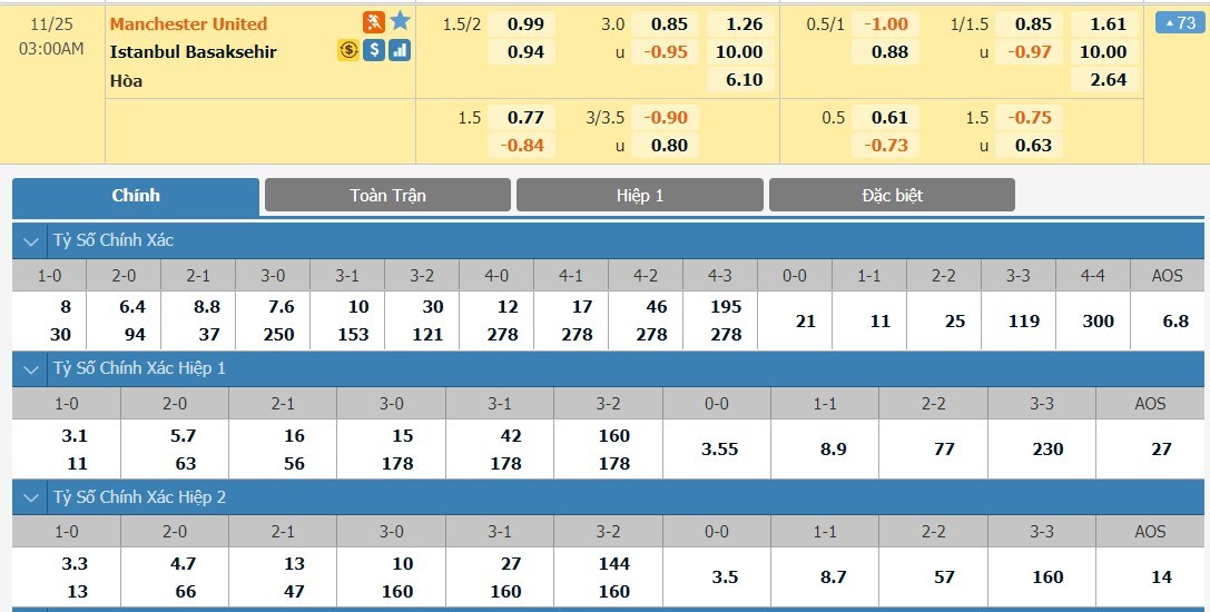 Tỷ lệ kèo cá cược bóng đá trận Manchester United vs Basaksehir F.K.