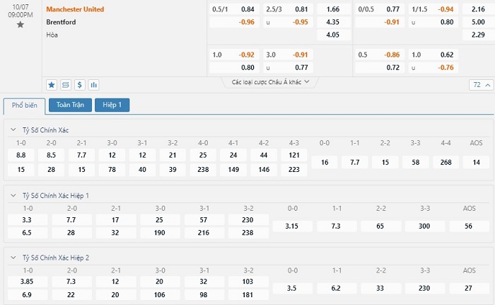 Xem tỷ lệ kèo cá cược bóng đá trực tuyến Manchester United vs Brentford