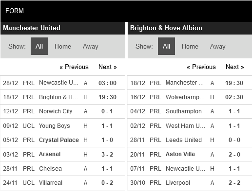 Thống kê phong độ Manchester United vs Brighton