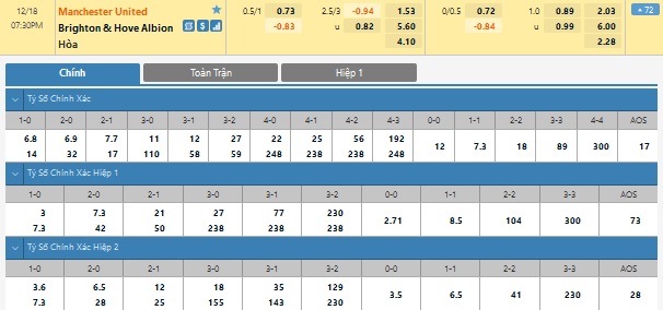 Xem tỉ lệ kèo cá cược bóng đá trực tuyến Manchester United vs Brighton