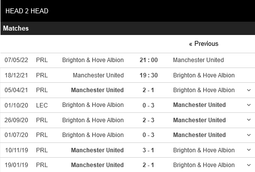 Thống kê đối đầu Manchester United vs Brighton
