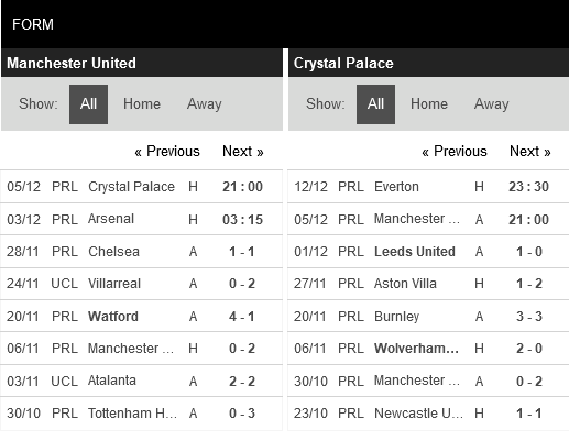 Thống kê phong độ Manchester United vs Crystal Palace