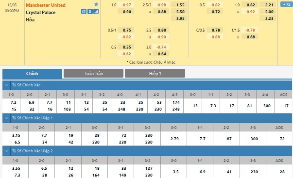 Xem tỉ lệ kèo cá cược bóng đá trực tuyến Manchester United vs Crystal Palace