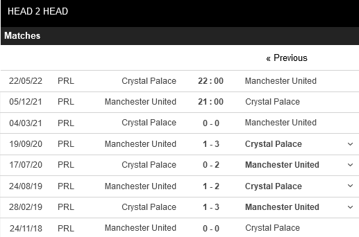 Thống kê đối đầu Manchester United vs Crystal Palace