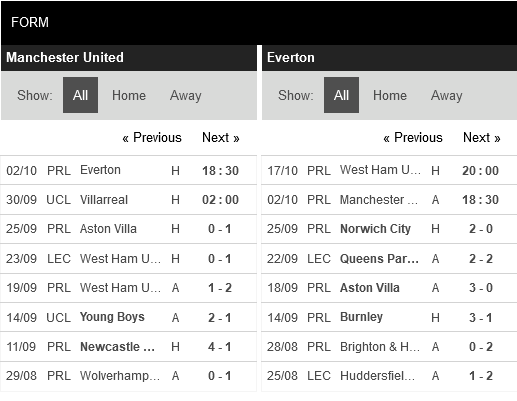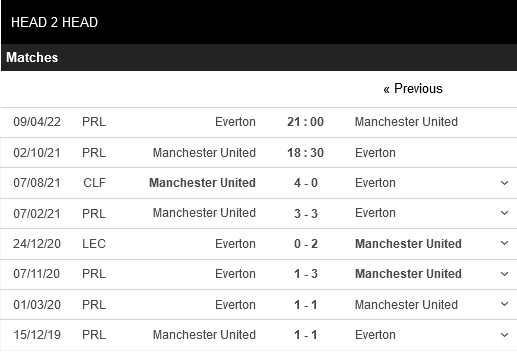 Thống kê đối đầu Manchester United vs Everton