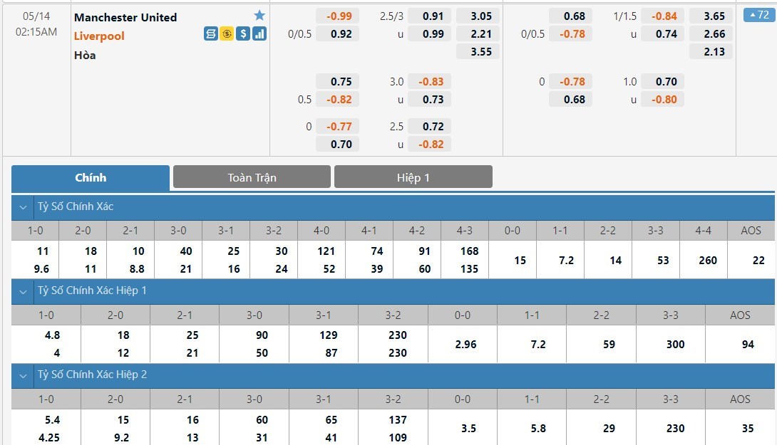 Tỷ lệ kèo cá cược bóng đá trận Manchester United vs Liverpool