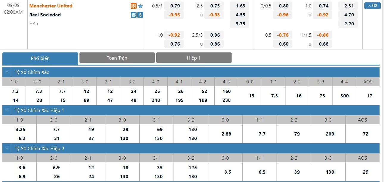 Xem tỷ lệ kèo cá cược bóng đá trực tuyến Manchester United vs Real Sociedad