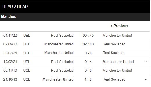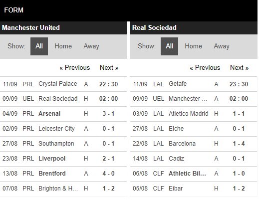 Thống kê đối đầu Manchester United vs Real Sociedad