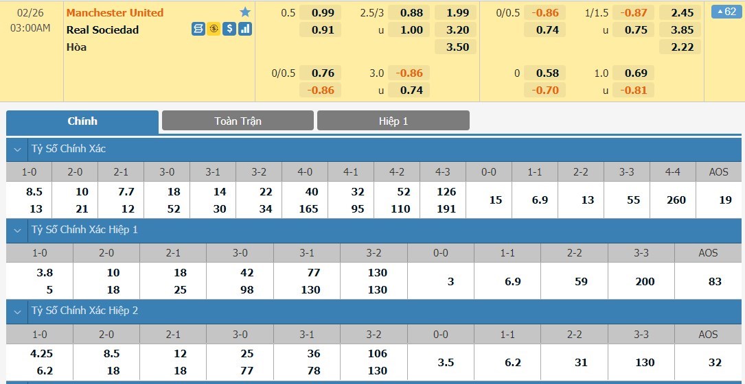 Tỷ lệ kèo cá cược bóng đá trận Manchester United vs Real Sociedad