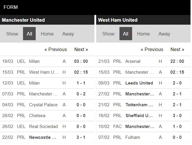 Thống kê phong độ Manchester United vs West Ham