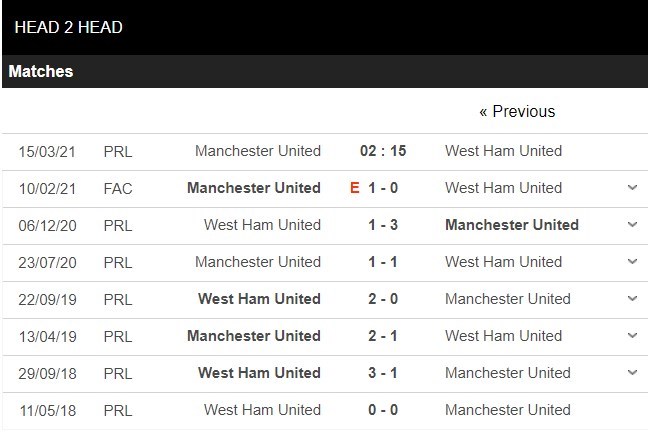 Thống kê đối đầu Manchester United vs West Ham