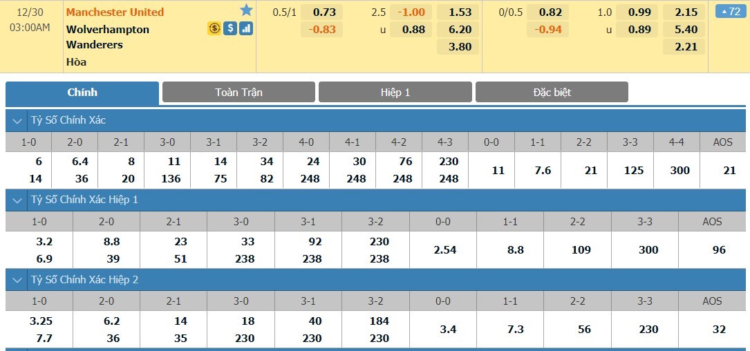 Tỷ lệ kèo cá cược bóng đá trực tuyến trận Manchester United vs Wolves