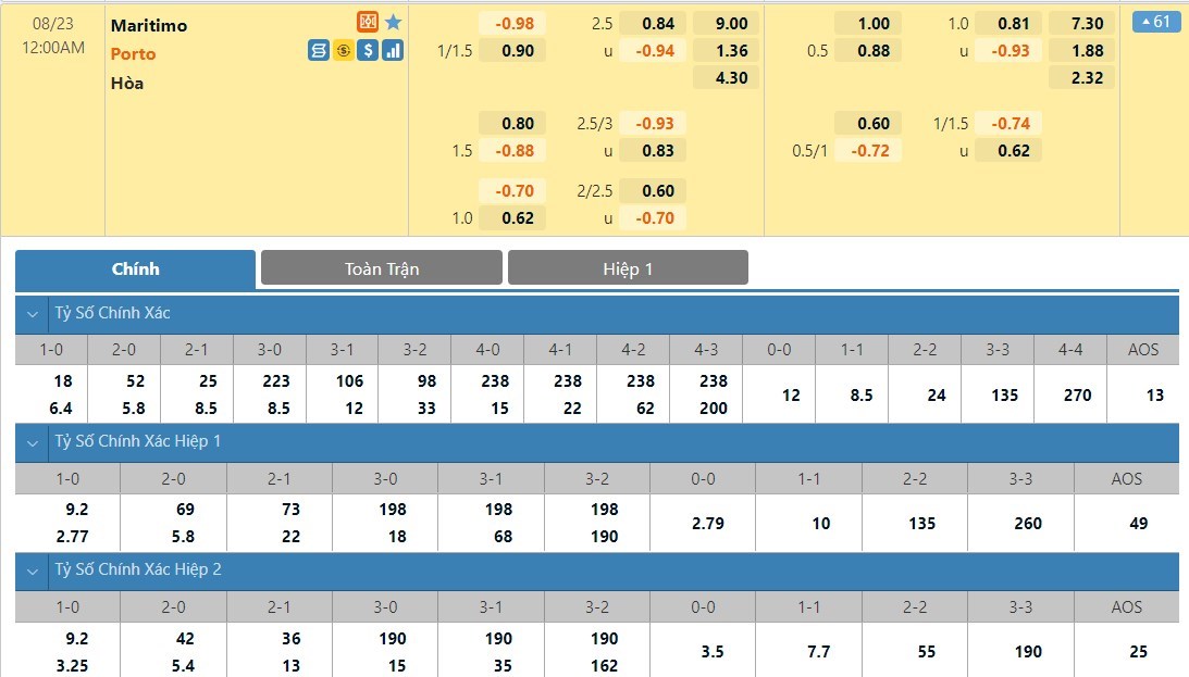 Tỷ lệ kèo cá cược bóng đá trận Maritimo vs FC Porto