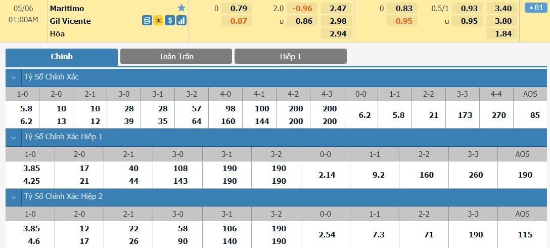 Tỷ lệ kèo cá cược bóng đá trực tuyến trận Maritimo vs Gil Vicente
