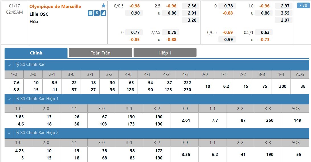 Tỷ lệ kèo cá cược bóng đá trực tuyến trận Marseille vs Lille