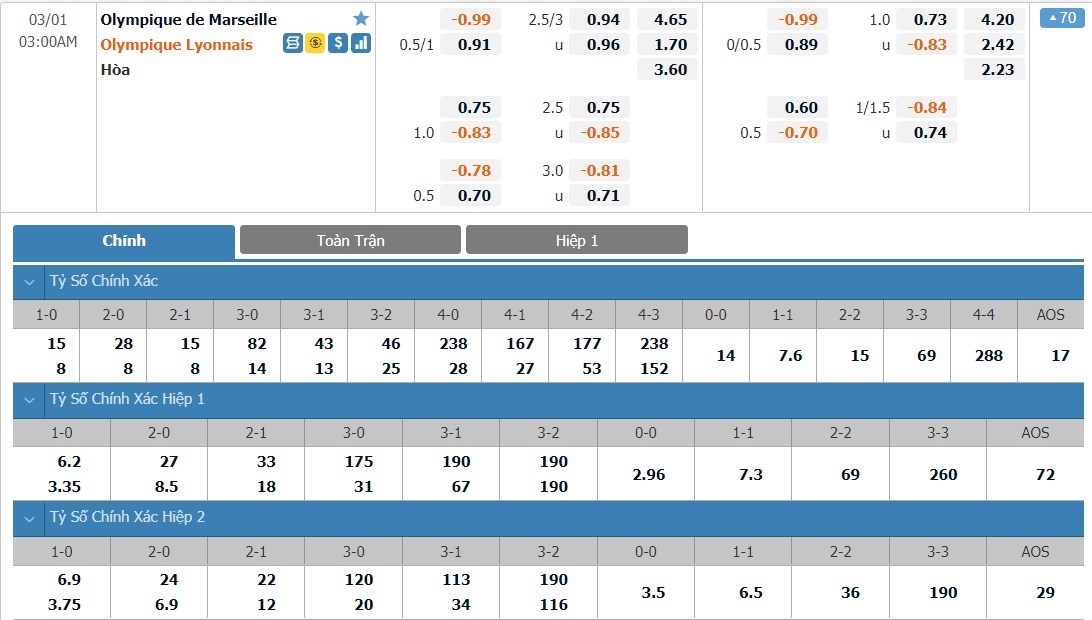 Tỷ lệ kèo cá cược bóng đá trận Marseille vs Lyon