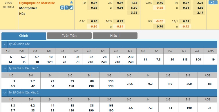 Xem tỷ lệ kèo cá cược bóng đá trực tuyến Marseille vs Montpellier