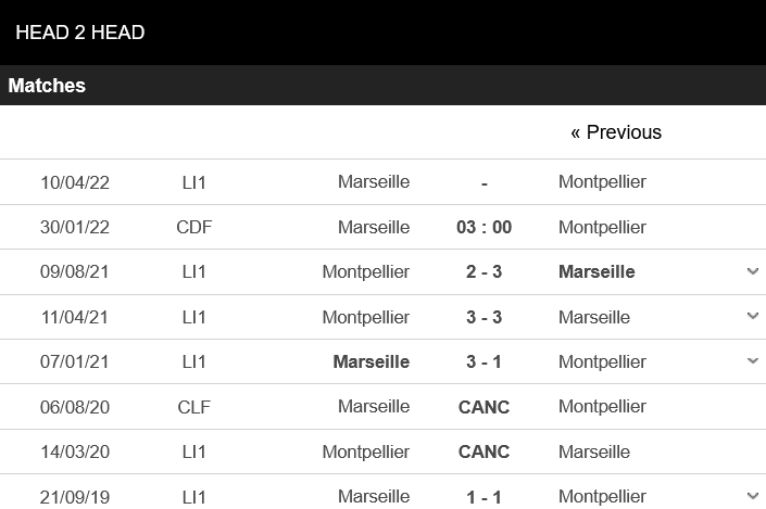 Thống kê đối đầu Marseille vs Montpellier