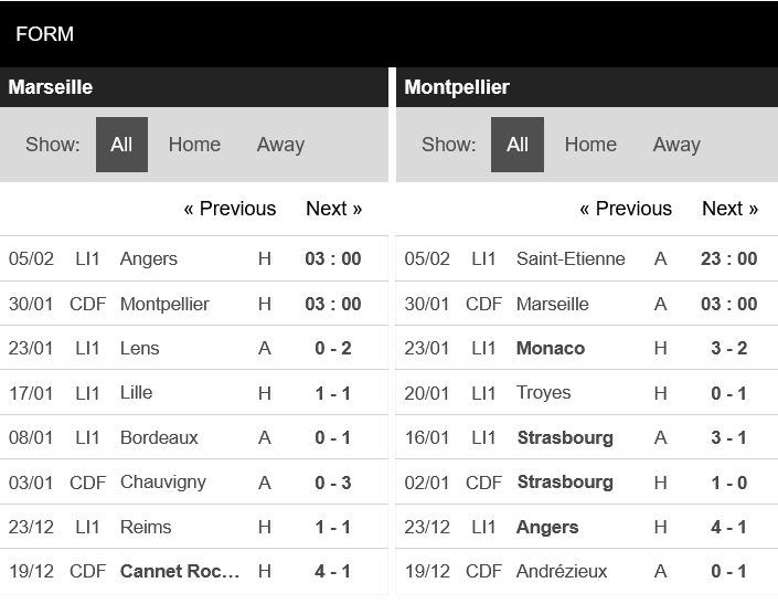 Thống kê phong độ Marseille vs Montpellier