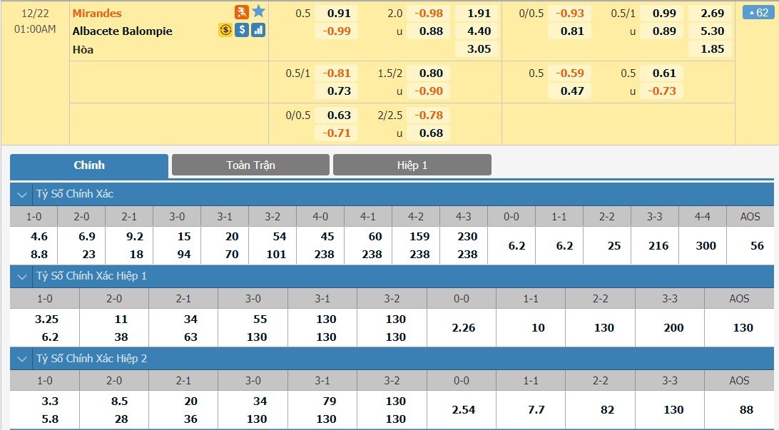 Tỷ lệ kèo cá cược bóng đá trực tuyến trận Mirandes vs Albacete