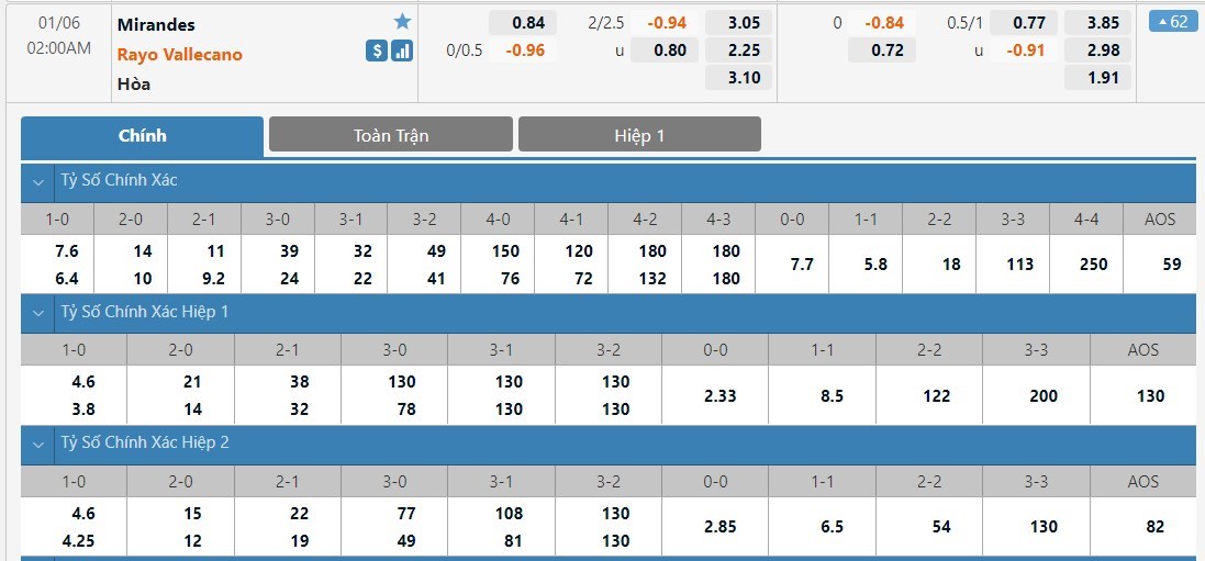 Tỷ lệ kèo cá cược bóng đá trận Mirandes vs Rayo Vallecano