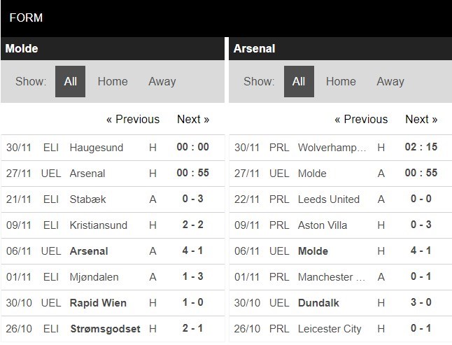Xem tỷ lệ kèo cá cược bóng đá trực tuyến Molde FK vs Arsenal