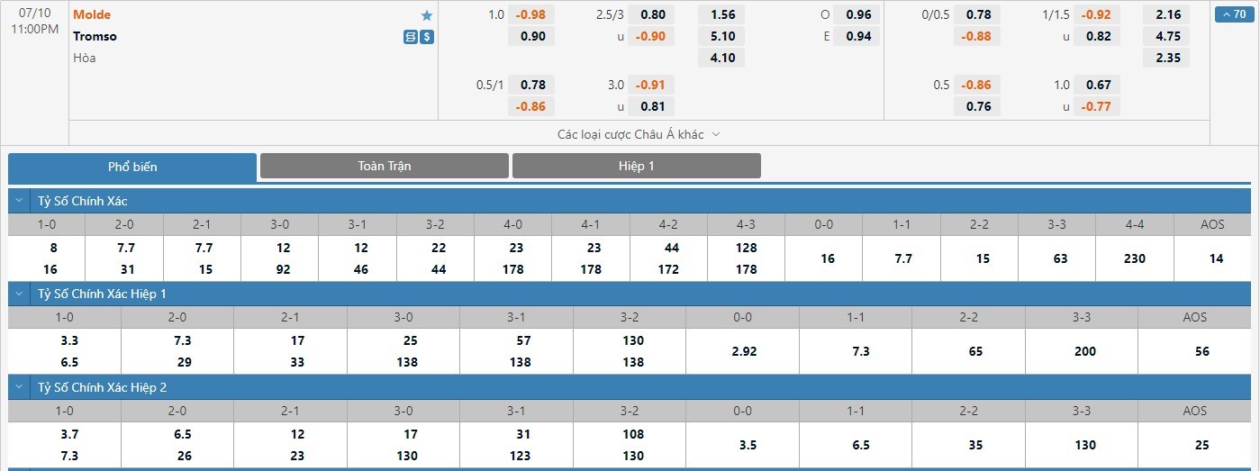 Tỷ lệ kèo cá cược bóng đá trận Molde vs Tromso