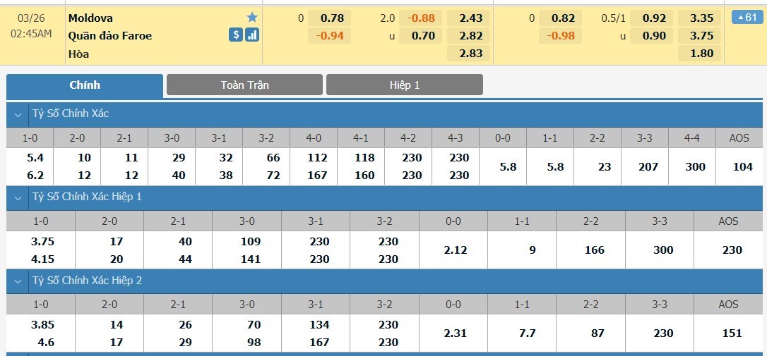 Tỷ lệ kèo cá cược bóng đá trận Moldova vs Quần đảo Faroe