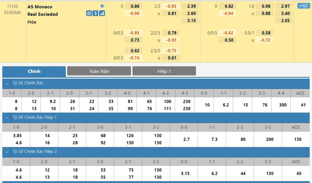 Tỷ lệ kèo cá cược bóng đá trực tuyến trận Monaco vs Real Sociedad