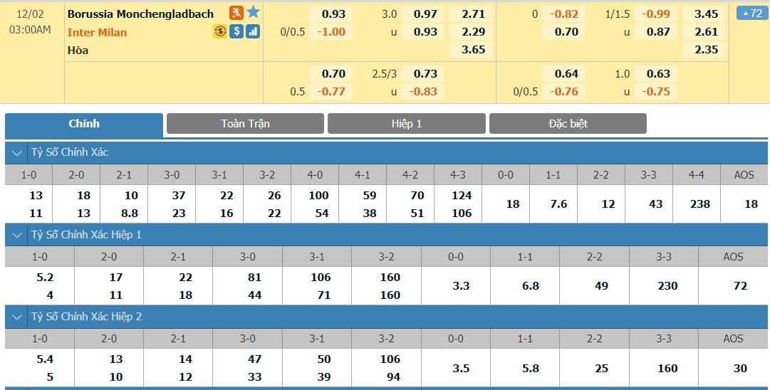 Tỷ lệ kèo cá cược bóng đá trực tuyến trận Monchengladbach vs Inter Milan