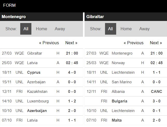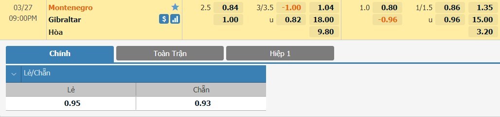Xem tỷ lệ kèo cá cược bóng đá trực tuyến Montenegro vs Gibraltar