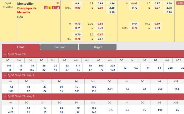 Xem tỉ lệ kèo cá cược bóng đá trực tuyến Montpellier vs Marseille