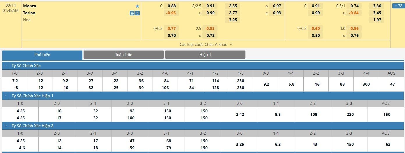 Tỷ lệ kèo cá cược bóng đá trận Monza vs Torino