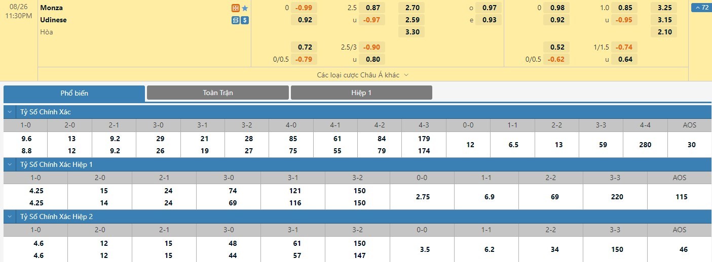 Xem tỷ lệ kèo cá cược bóng đá trực tuyến Monza vs Udinese