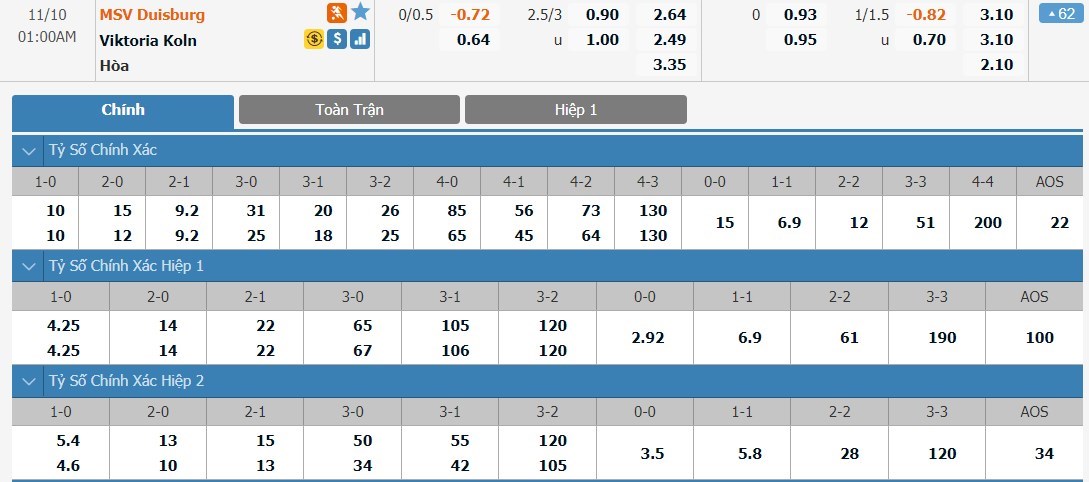 Tỷ lệ kèo cá cược bóng đá trận MSV Duisburg vs FC Viktoria Koln