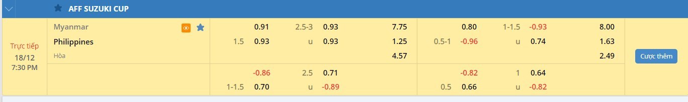 Tỷ lệ kèo cá cược bóng đá trực tuyến trận Myanmar vs Philippines