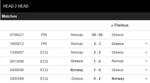 Thống kê đối đầu Na Uy vs Hy Lạp