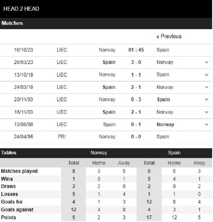 Thống kê đối đầu Na Uy vs Tây Ban Nha