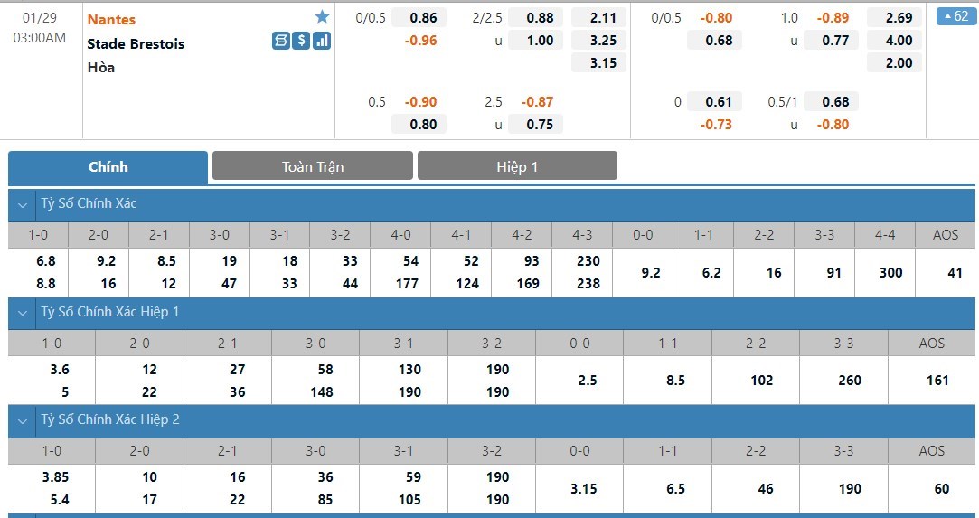 Tỷ lệ kèo cá cược bóng đá trực tuyến trận Nantes vs Brest